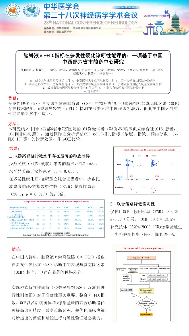 本次壁報(bào)交流涵蓋神經(jīng)病學(xué)各分支領(lǐng)域,內(nèi)容豐富且兼具深度與創(chuàng)新性。其中,趙雄飛副院長(zhǎng)、張國(guó)勛副主任團(tuán)隊(duì)的研究聚焦于“腦脊液κ-FLC指標(biāo)在多發(fā)性硬化診斷性能評(píng)估:一項(xiàng)基于中國(guó)中西部六省市的多中心研究”這一關(guān)鍵課題。團(tuán)隊(duì)通過多中心協(xié)作的方式,納入中國(guó)中西部6省市7家醫(yī)院的161例受試者,通過回顧性分析評(píng)估CSFκ-FLC相關(guān)指標(biāo)(濃度、指數(shù)、鞘內(nèi)分?jǐn)?shù)[κ-FLC IF]等)的診斷效能,并與OCB比較。