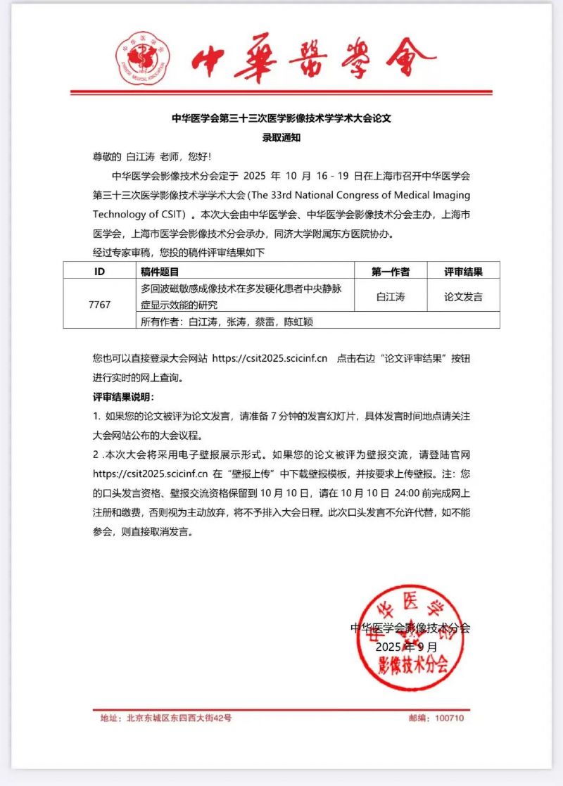 本次大會以“智慧影像 協(xié)同創(chuàng)新”為主題,在全國數千位醫(yī)學影像技術精英的匯聚中,前沿科技的鋒芒與海派文化的包容相得益彰。我院醫(yī)學影像科CT/MRI室張濤主任團隊白江濤主管技師、樊麗媛主管技師榮幸站在了全國舞臺,展示科室科研初步成果。