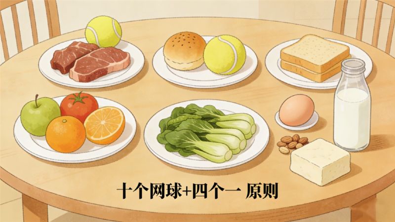 3. 吃飯跟著“口訣”來:遵循“十個(gè)網(wǎng)球+四個(gè)一”原則:肉類不超1個(gè)網(wǎng)球量,主食2個(gè)網(wǎng)球,水果3個(gè)網(wǎng)球,素菜不少于4個(gè)網(wǎng)球;每天1個(gè)雞蛋、1斤牛奶、1把小堅(jiān)果、1塊撲克牌大小的豆腐;少放鹽、少油炸,多喝溫水,每天不少于1500ml;