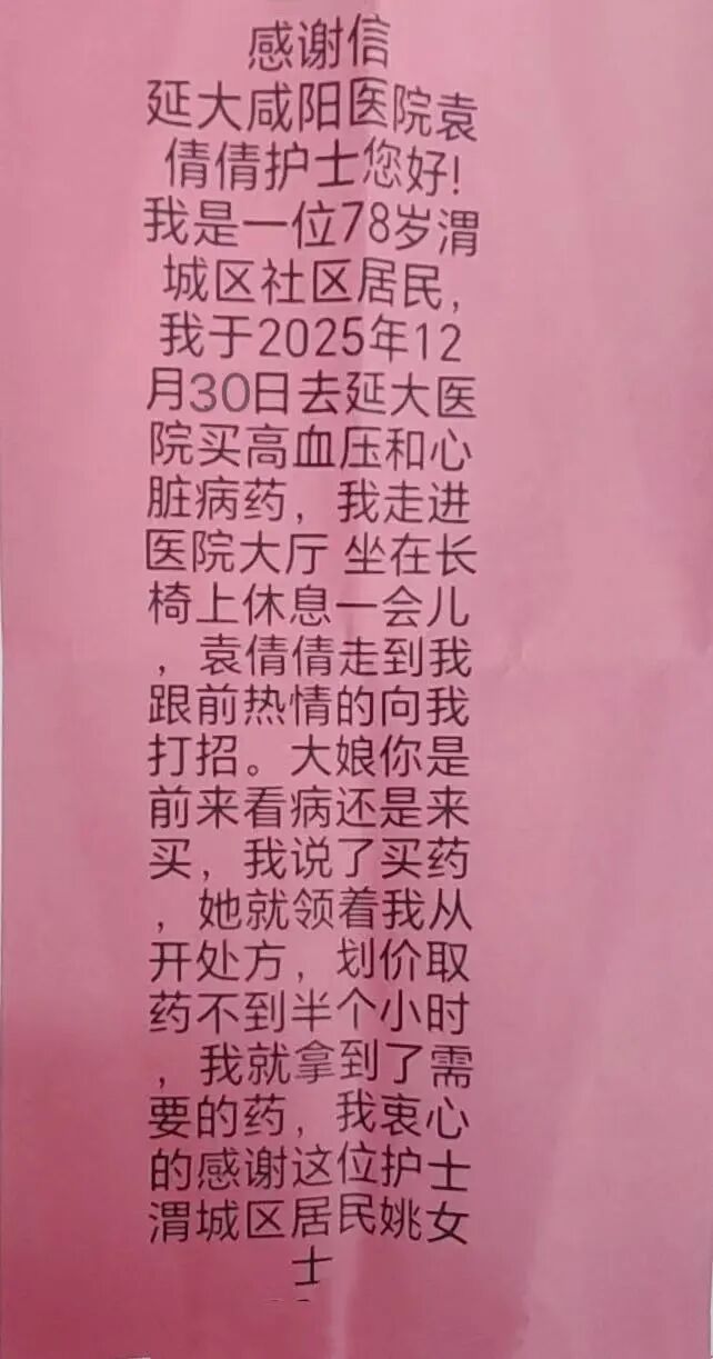 一紙素箋載溫情,字里行間皆是暖。近日,延安大學(xué)咸陽醫(yī)院收到了一封格外真摯的感謝信,信中字字句句飽含著渭城區(qū)78歲姚奶奶的感激之情。