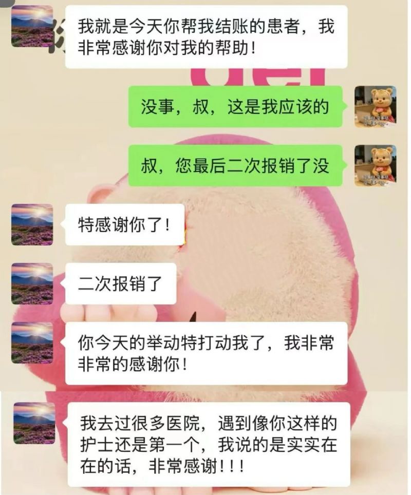 老人出院回家后,這件事本該就此翻篇。但幾天后,護(hù)士的微信上突然收到多條消息。點(diǎn)開一看,是那位退伍軍人患者發(fā)來的——“閨女,我回家了,心里一直惦記著你。”“我去過很多醫(yī)院,遇到像你這樣的護(hù)士還是第一個(gè),我說的是實(shí)實(shí)在在的話,非常感謝!”字里行間,是老人最樸素的表達(dá)。護(hù)士有些意外,隨即心頭一暖。她回復(fù)道:“叔,這是我應(yīng)該做的。您以前守護(hù)國(guó)家,現(xiàn)在能幫到您,我也特別開心?!彼龥]想到,一件自己都快忘了的小事,竟被老人這樣鄭重地記在心里。