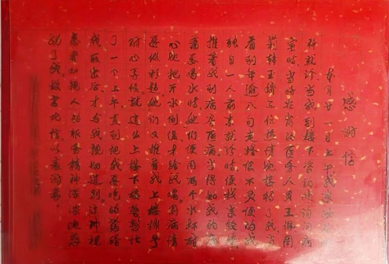 幾天后,這位老人又出現(xiàn)在醫(yī)院。這一次,他不是來(lái)看病,而是來(lái)尋人。他捧著一塊紅色的牌匾,小心翼翼送到導(dǎo)醫(yī)臺(tái)。匾上,工工整整的手寫(xiě)字,一筆一畫(huà)寫(xiě)得格外認(rèn)真,寫(xiě)滿了感謝的話語(yǔ)。